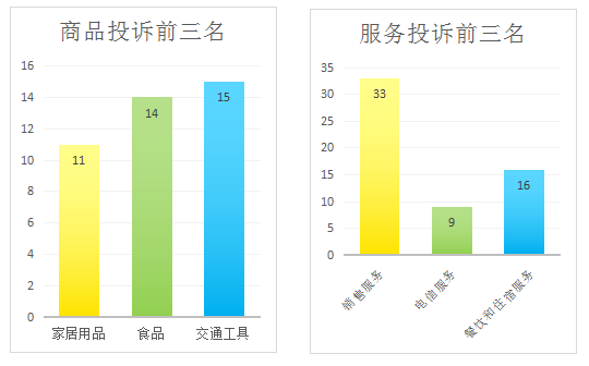 2、餐饮和住宿。主要问题:存在“禁止自带酒水”霸王条款;无营业执照、许可证经营;住宿环境差,虚假宣传;不按约定优惠,侵害消费者权益。